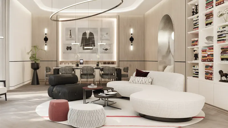 Designed with the ethos of Karl Lagerfeld's fashion collections, the architectural form of the villas incorporates minimalistic and sleek lines, a monochromatic color palette, and textured materials, echoing the timeless aesthetic. Each villa features a central catwalk entrance, spiraling staircase, sunken lounge, library lounge, and dedicated Majlis room, creating an atmosphere of refined elegance.