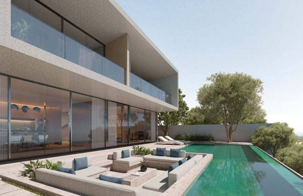 Clean lines and a minimalist aesthetic define this mansion, featuring lavish travertine surfaces on the façade and contemporary dark brass screen details. These elements serve not only as decor but also as functional shading, creating a symphony of style and comfort. The outdoor spaces are designed to enable intimate social gatherings, offering versatile areas to share moments with friends and family, all while immersed in the serenity of the outdoors.