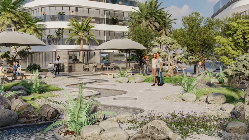 Spread across a generous 300,000 sq. ft. of land, the development boasts an extensive 200,000 sq. ft. of seamlessly integrated amenities. From state-of-the-art fitness centers to rooftop gardens with breathtaking city views, life in this community is truly elevated. Residents have access to recreation and entertainment spaces, including a basketball court, BBQ area, mini-golf, outdoor cinema, and more.