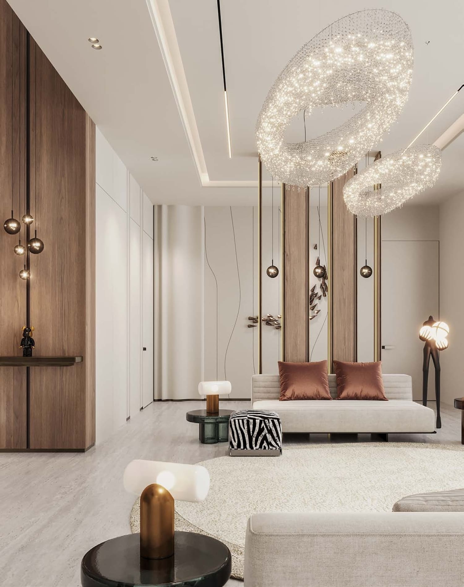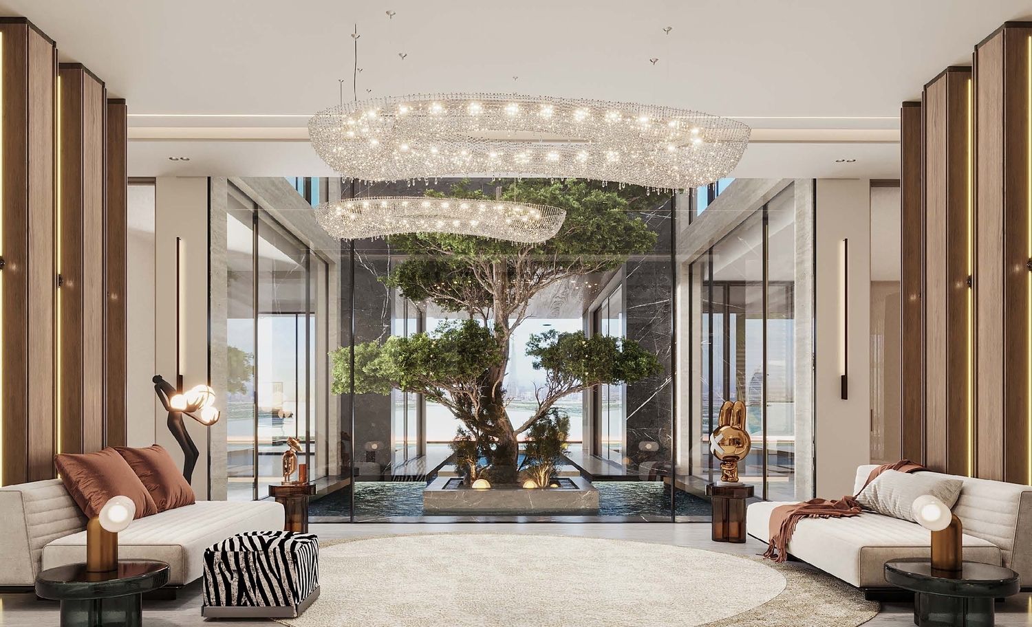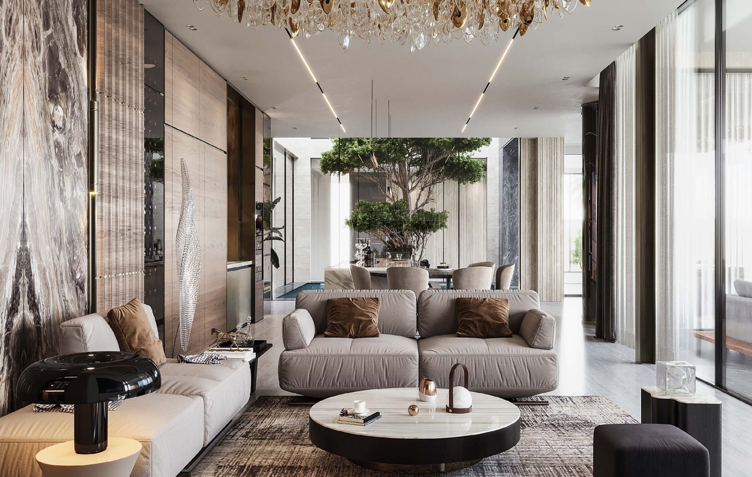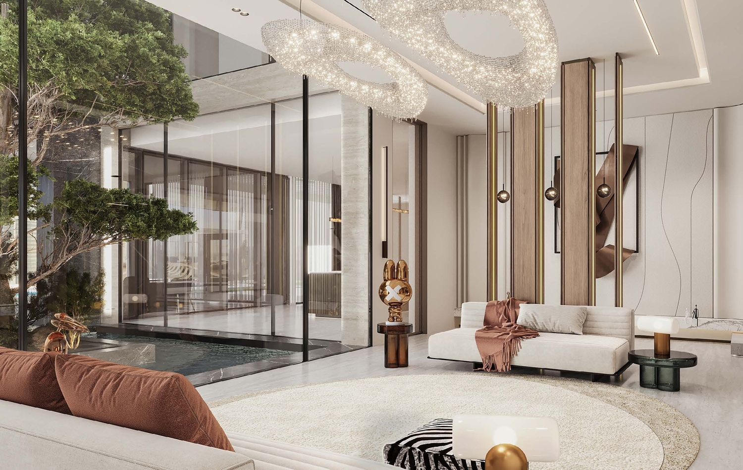 Villa Amaya at Palm Jumeirah is a sensorial oasis that encapsulates a luxurious blend of materials sourced from around the world. From the dramatic Marquina marble of the Basque country to the pure Calacatta from Tuscany, and the enigmatic Emperador marble from southeast Spain, every detail is meticulously curated. The infusion of natural wood and gleaming bronze, coupled with rich leathers, fabric, and flourishing foliage, creates a harmonious composition that engages the senses, making Villa Amaya a haven of sophistication from the outside in.